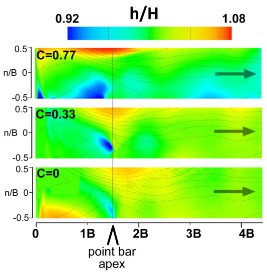 The normalized flow surface elevation (h/H) patterns were very sensitive to planform curvature (Figure 2), with large differences in the inlet section (<1.5 s/B longitudinal position) emerging between C = 0.77 and C = 0.33, and between C = 0.33 and C = 0. Similarities between the C = 0.33 and C = 0 did exist, and included a semicircle of maximum flow surface values over the pool (left bank centered at 1.5 s/B) and a minimum flow surface value along the right bank over the point bar apex. These areas of similarity in h/H were regulated by bedform topography, but curvature and superelevation effects suppressed bedform topographic control for C > 0.33. At the tighter curvature of C = 0.77 the centrifugal forces elevated the water surface to h/H ≥ 1.08 and the zone of maximum values stretched from the inlet to 2 s/B and pinched into a narrower lateral extent, while the water surface at the opposite bank dropped to h/H ≤ 0.92 from 0 to 1.4 s/B, followed by other zones of lowered surface values (h/H < 1) at 2 s/B and from 3 s/B to 4 s/B. The complete absence of planform curvature in the C = 0 system did not prohibit bedform topography from creating a backwater effect behind the point bar, noted by the zone of maximum h/H along the right bank from 0 s/B to 1 s/B.