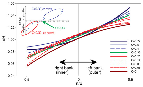 The impact of planform curvature was illustrated with transverse plots of h/H at 1.5 s/B, the point bar apex (Figure 3). Considering the normalized flow surface elevation as a function of normalized transverse distance, (h/H) = Fh(n/B), the second order derivative of the function Fh″ (n/B) was used to identify the convexity of the flow surface curves with positive and negative values indicating convex and concave surfaces, respectively. We find that C = 0.33 was the divide that separated the h/H patterns into two types. In tight meander bend with C > 0.33 the transverse pattern of h/H was convex, and for mildly curved channels with C < 0.33 it had a concave pattern. At a curvature of C = 0.33 the h/H profile Fh″(n/B) was close to zero and the h/H profile was flat. The mechanism might be that the centrifugal effects piled up the water in high curvature channels and created convex h/H superelevation transverse profiles at the meander apex, while open meanders the bedform topography created backwater effects and concave h/H transverse profiles.