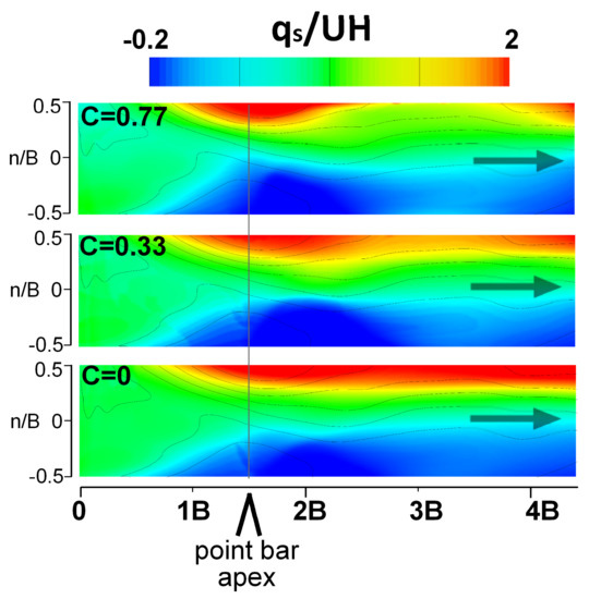 Streamwise unit discharge qs/UH for channel curvature C = 0.77, 0.33, and 0 conditions.