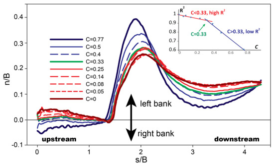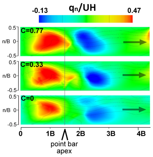 The distribution of transverse unit discharge, qn/UH, were also largely insensitive to curvature, where C = 0.77, 0.33, and 0 each experienced a pronounced transport to the outer bank (positive values) upstream of the apex and transport to the inner bank further downstream (Figure 5). The impact of bed topography was noted in the damped oscillation patterns of qn/UH with the maximum leftward mass transport at 1 s/B, just upstream of the point bar, and rightward transport at about 2.3 s/B, downstream of the pool. As curvature increased the single ovate shaped hot-spot of outer-bank directed mass transport that extended beyond the apex for C = 0.77, became split at the tip for C = 0.33, and then reduced to a smaller region for C = 0 (Figure 5). A parallel set of changes occurred in inner-bank-ward mass transport, where the initiation of this inner bank transport region moved further downstream as curvature reduced from C = 0.77 to C = 0. The differences in mass transport between the C = 0.33 and C = 0 simulations were only about 5% based on transversely averaging (< qn/UH >) (Figure 6). The inset of Figure 6 shows the likelihood (here we use coefficient of determination, R2) of < qn/UH > between each curvature and the straight channel condition (C = 0, R2 = 1). The lower the R2, the transverse unit discharge is more complex than in the straight channel.