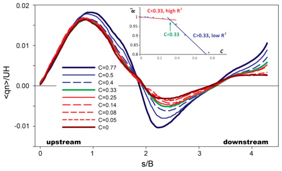 Transverse unit discharge averaged over the transverse direction. The inset shows the R2 of transverse unit discharge < qn/UH > between each curvature, C, and the straight channel condition (C = 0, R2 = 1); a lower R2 suggests greater hydraulic complexity for transverse unit discharge.