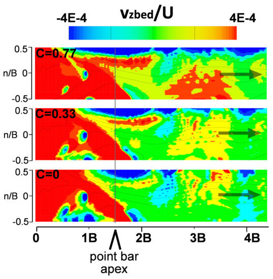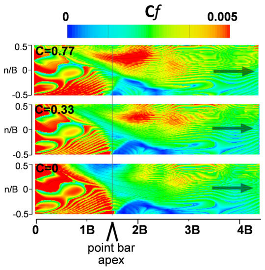 The bed shear distribution, Cf, is determined in part by near-bed velocities (Figure 9). Along the right bank side at the channel inlet, the bed shear was evidently controlled by the bed topography, with maximum values for all planform curvatures extending up to the point bar. At the point bar cross-section the bed shear was controlled by bedform topography over the point bar, with a minimum Cf values for C ≤ 0.33 curvatures, suggesting conditions for sediment deposition. However, opposite the point bar the bed shear was controlled by planform curvature, with maximum Cf values in the C = 0.77 simulation and minimum Cf values in the C = 0 simulation. These maximum Cf values in the C = 0.77 were over the pool area from 1 s/B to 2.5 s/B, where sediment erosion was most active. Note that the artificial strips observed in bed shear Cf distribution are caused by the structured meshing approach used to represent the bedform topography. This factor could be reduced/smoothed if a finer mesh is applied.