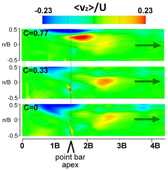 Normalized vertical velocity <vz>/U for channel curvature C = 0.77, 0.33, and 0 conditions, with positive values upward flows, negative values downward flows.