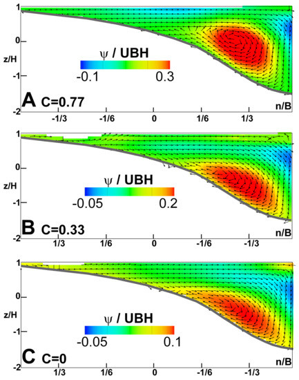 Transverse stream function distribution ψ/UBH reveals the secondary circulation of transverse flow cells rotating at the meander apex 1.5 s/B for channel curvature C = 0.77 (A), C = 0.33 (B), and C = 0 (C), with positive values representing clockwise rotation direction when facing upstream, and negative values representing counter-clockwise rotation when facing upstream.