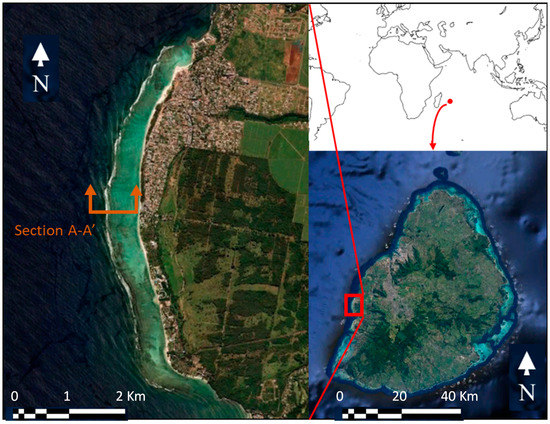Flic-en-Flac beach, located on the west coast of the island of Mauritius (Figure 1), is one of the most visited beaches in Mauritius and it is of socio-economic relevance for the country. Over the last years, the beach has experienced events of recurring erosion and it has been classified as a beach of high management priority in terms of erosion risks [39]. It extends approximately 5 km from north to south in a slightly convex shape. The morphology of Flic-en-Flac represents a typical sandy beach in Mauritius; such that it is bounded by a lagoon extending a few hundred meters and surrounded by a barrier reef. The contour of the shoreline mirrors the contour of the barrier reef, which lays about 250–400 m apart. A shallow lagoon is comprised between the barrier reef and the shoreline, as seen in Figure 1.