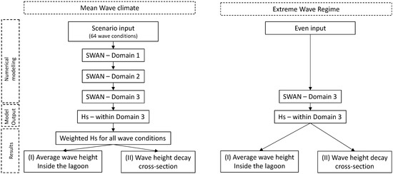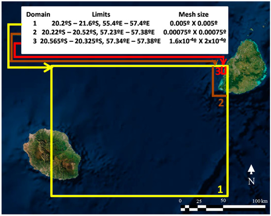 The modeling approaches for the two distinct wave climates are shown in Figure 2. A nesting strategy has been followed for the mean wave conditions whereas a single grid approach has been used for the extreme regime (Figure 3). The largest model domains’ (Domain 1) boundaries range from 20.2° S to 21.6° S and 55.4° E to 57.4° E. The southernmost boundary has been chosen to include Reunion Island, to ensure that the refraction and diffraction of southwesterly waves are included. A coarse resolution of the computational and bathymetric grid of 0.005° by 0.005° has been used, in the longitudinal and latitudinal directions respectively. The second computational grid (Domain 2) has been reduced to 0.00075 by 0.00075° length cells, and includes the southwest portion of the Mauritian coast, to account for wave transformation when the waves are approaching the nearshore area. The rectangular boundary coordinates are 20.22° S to 20.52° S and 57.23° E to 57.38° E. The third and most refined grid has cell sizes of 0.00016° in the longitudinal direction and 0.0002 ° in the latitudinal direction. Such spatial resolution roughly equates to 18 m × 22 m. Domain 3 extends between 20.265° S to 20.325° S and 57.340° E to 57.38° E.