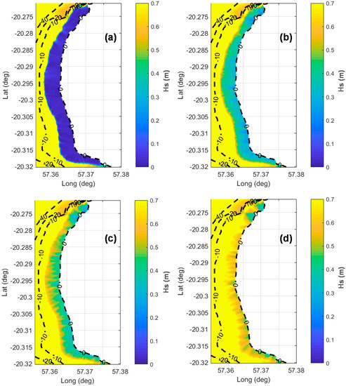 Coral reefs are important elements in tropical and subtropical shores. They are among the most diverse and productive ecosystems of the oceans since they provide a large number of goods and services such as food, habitat, biodiversity, tourism, recreation, shoreline protection, and erosion regulation [1]. In particular, coral reefs play an important role in coastal areas acting as natural breakwaters that can dissipate up to 97% incident wave energy [2] controlling the shoreline evolution in their lee [3]. In addition, taking into account that low-crested detached breakwaters generate a wave height reduction of 30%–70% [4,5,6], the wave dissipation effect of coral reefs is generally similar or even larger than conventional structures.