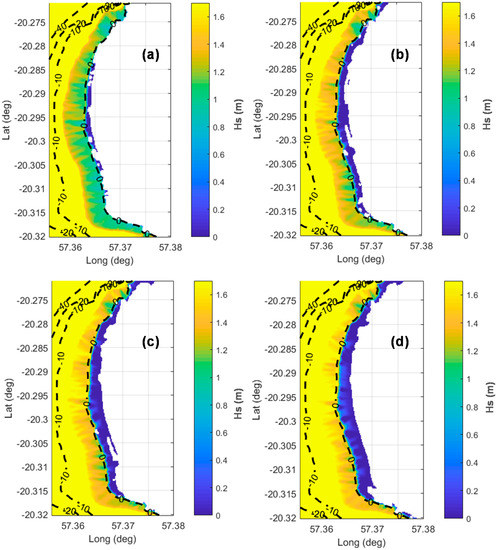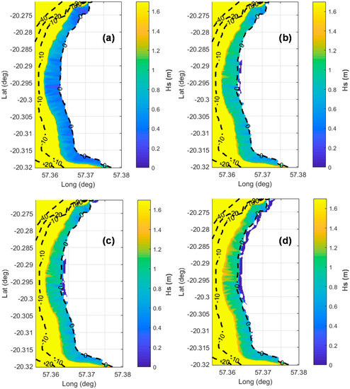 Figure 4 and Figure S3 (supplementary material) feature color maps of the Flic-en-Flac lagoon representing the average Hs inside the lagoon for all scenarios, calculated as exposed in Section 2.2. In these figures, large variations in the values of Hs can be observed for the different scenarios, highlighting the influence of the different parameters: in particular sea level and reef conditions, in the wave height entering the lagoon.