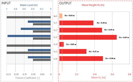 Bar chart of average significant wave height inside the lagoon for all scenarios. Left: input parameters, friction coefficient (gray), and sea level (blue). The reef health status is indicated by the friction coefficient (see Table 1). Right: output parameter, wave height (red).