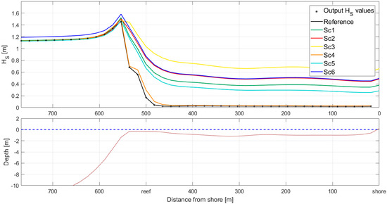 Spatial distribution of Hs across A-A’ section (Figure 1) for all scenarios. The reference scenario is the solid black line, whereas the coloured lines represent the Hs propagation for all scenarios. Units in m. The bottom graph shows the water depth to illustrate the influence of the reef in the wave height.