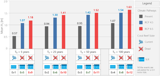 The mean wave climate analysis shows that waves propagated over the reef are larger inside the lagoon under the following constraints: (i) high water levels, (ii) high waves, and (iii) lower bottom friction coefficients. Similarly, for the extreme wave climate analysis, higher waves are modeled under coupled SLR scenarios and decreased bottom friction.