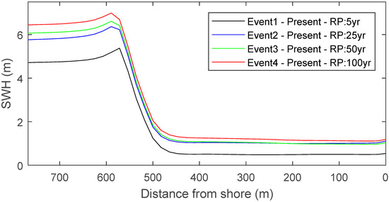 Similarly, the larger the cyclonic conditions, the higher the waves inside the lagoon, for present and future SLR projections. Some of the relative cases can be observed in Figure 10 depicting the Hs field across the reef for events 1 to 4. The magnitude of the increase in wave heights inside the lagoon between 5-year and 100-year return period events ranges from 38% (Ev12 with respect to Ev9) to 88% (Ev4 with respect to Ev1).
