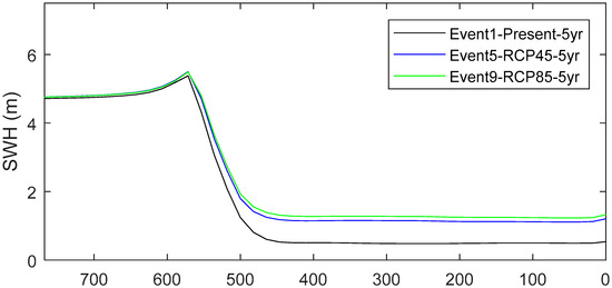 For different sea levels and friction coefficients, values of Hs along the transect A-A’ are shown in Figure 11 for RP = 5 years. An SLR of 0.52 m (RCP4.5) and a change of reef condition results in an increase of 88% in the average Hs within the lagoon. A greater SLR of 0.68 m (RCP8.5) with also dead coral reef entails an increase of the average Hs within the lagoon of 107% with respect to present conditions.