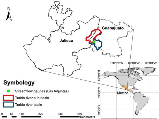 The study area used in this research is the Turbio river sub-basin (Figure 1). The sub-basin is located in the Lerma Santiago Hydrological Region, which includes the states of Guanajuato and Jalisco in Mexico. The sub-basin has an area of 2983 km and is one of the most important for agricultural production of the country.