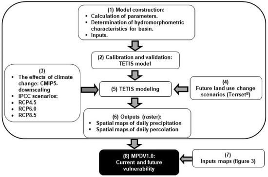 The methodology that we propose to carry out this research has included the development of a Predictive Vulnerability Interface that we have called MPDV1.0. It has been programmed in Visual Basic (Microsoft, Washington, DC, USA) language and allows quantifying the hydrological, environmental, economic, social and global vulnerability of a hydrological basin. MPDV1.0 integrates the distributed hydrological model TETIS [34,35], the Global Climate Models (GCM) of the Inter-Comparison of Coupled Models-Phase 5 (CMIP5) Project [36], and RCP4.5, RCP6.0 and RCP8.5 scenarios of the Intergovernmental Panel on Climate Change (IPCC) [37]. The foregoing is following the scheme shown in Figure 2. Unlike the methodologies proposed by [38,39,40,41], MPDV1.0 calculates vulnerability in a distributed way, including all the processes and storages of the hydrological cycle through its modeling in TETIS. In addition, the effects of climate change and land use change are included as well. In the hydrological modeling with TETIS, the future land use changes are introduced, estimated with the Terrset software (Clark Labs, Worcester, MA, USA) [42]. This makes the MPDV1.0 a different and innovative way of estimating vulnerability. Another difference from the existing methodologies is that it allows quantifying five types of vulnerabilities (i.e., hydrological, environmental, economic, social and global).
