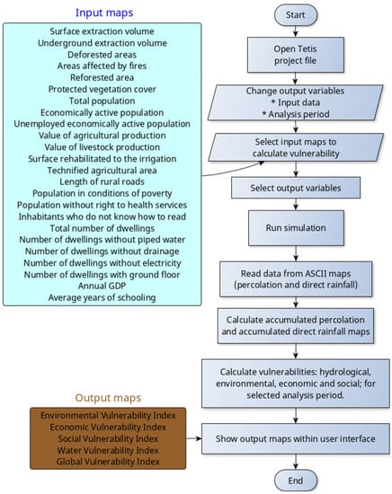 The MPDV1.0 executes the connected tools and the input maps following the flowchart shown in Figure 3. The input maps have been processed in ArcGIS (ESRI, Sacramento, CA, USA), considering the available information, obtained from different governmental departments. In the research, the error on the model and calculation of vulnerability is not estimated because the input maps are official information in Mexico and are carefully validated. These maps are introduced in ascii format in the MPDV1.0. The MPDV1.0 conducts information cross-checks to obtain hydrological, environmental, economic, social and global vulnerability.