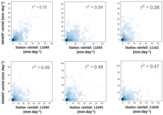 Despite the overestimates observed in Figure 4, we decided to use the MSWEP, because the interpolated rainfall from the weather stations presents 13.5% overestimates in cells far from the stations compared to the MSWEP. We also evaluated in the analysis period the differences in the annual average accumulated precipitations and we obtained that the observed precipitations are greater than those of the MSWEP with an average of 175 mm year. There are other products with precipitation information, such as: NOAA CPC Morphing Technique (CMORPH), Integrated Multi-satellite Retrievals for GPM (IMERG) and Climate Hazards Group Infrared Precipitation with Stations (CHIRPS). Studies such as those carried out by [46,50,51,52] consider these high-precision products and have been implemented in various regions, obtaining correlations of 0.65 to 0.8. However, the information period for these products is limited. Therefore and considering the MSWEP has a longer reporting period and that similar correlations are obtained, we have decided to use it in the research.