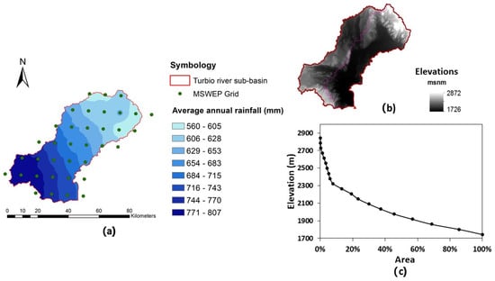 (a) Accumulated average annual rainfall obtained using Multi Source Weighted-Ensable Precipitation (MSWEP) product information, (b) Digital Elevation Model and (c) hypsometric curve.