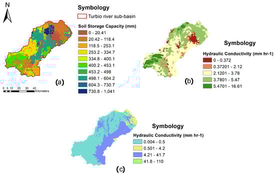 (a) Static storage (Hu), (b) soil hydraulic conductivity (Ks) and (c) hydraulic conductivity of rocky extract (Kp).