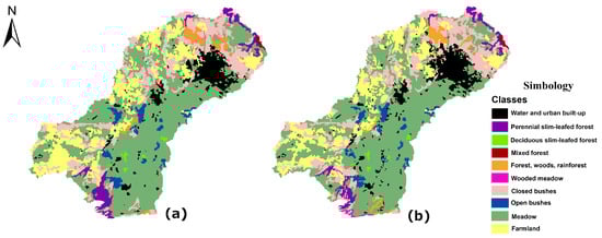 Land use and vegetation cover maps used in the modeling of future scenarios: (a) year 1997 and (b) series VI.