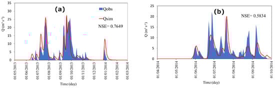 Efficiencies of hydrological modeling with TETIS in the calibration period: (a) wet year and (b) dry year (—Qobs = measure discharge and •Qsim = simulated discharge).