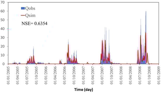 The performance of the model in temporary validation, once again, shows an acceptable behavior of the TETIS model, with an NSE of 0.63 (Figure 10). The NSE obtained in validation shows an acceptable capacity of the model to reproduce the flows in another period, which is different from the one used in the calibration. According to [69], validation is usually considered acceptable if NSE > 0.5 and very good if NSE > 0.7.