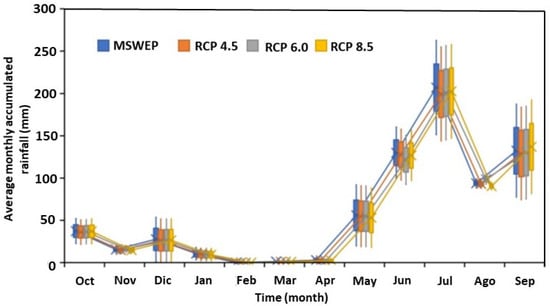 When downscaling the results obtained by the GCM of CMIP5, it was possible to observe a significant reduction in precipitations of the year 2035 for the three scenarios of IPCC (Figure 11). The foregoing depends on the control period used in the comparison. This control period has been generated with historical precipitation data from the MSWEP (period: 1982 to 2014). We have obtained that the REA-CMIP5 models predict an average decrease in rainfall of 1 mm day for the IPCC scenarios. The greatest differences between future projections are presented in the months of the rainy season. The high variability observed in Figure 11 corresponds to the uncertainty calculated for the three scenarios, which is ±2 mm day. We find the same trend in evaluating annual projections (Table 4). The same pattern was observed with annual anomalies, which predict an average decrease in rainfall of 34.7 mm year. The results in Table 4 show that in the near future, the RCP4.5 scenario represents the most critical conditions with a greater decrease in rainfall. However, the projections of REA-CMIP5 in the year 2100 show that RCP8.5 is the most critical with an average decrease in rainfall of 80 mm year (period: 2075–2100).