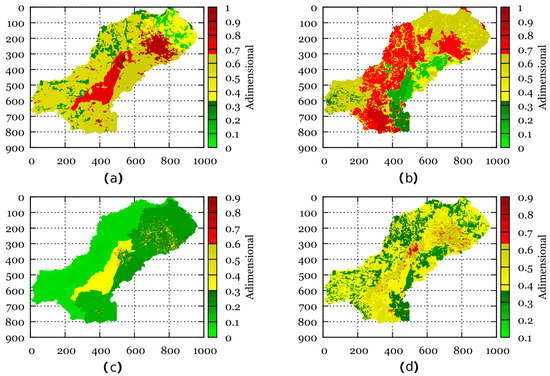 Vulnerability rate maps obtained with the MPDV1.0 for the current conditions of the Turbio river sub-basin (vulnerability: (a) Environmental, (b) Economic, (c) Social and (d) Global).