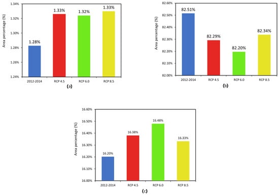 Global vulnerability occupation area (2035 year): (a) high (), (b) medium () and (c) low ().