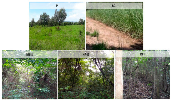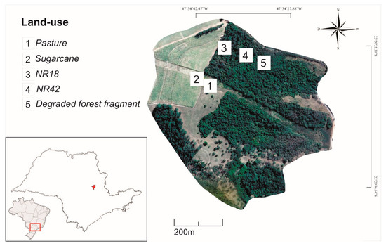 For the development of this study, we selected five different land uses: (a) pasture (P); (b) sugarcane (SC); (c) 18-year-old passive forest restoration by natural regeneration (NR18); (d) 42-year-old passive forest restoration by natural regeneration (NR42), and (e) degraded forest fragment (DFF) (Figure 1 and Figure 2). The DFF area is currently isolated, but before this measure, there were intense cattle invasions associated with frequent burning in the contiguous sugar cane fields during the dry season that invaded the remnant fragment. Oxisols and Ultisols represent the soils of the study area, according to Soil Taxonomy, 2014 [35] with sandy loam and loamy, sandy textures (Table 1). The soil texture of the superficial horizon did not show important variations among the study sites being considered homogeneous.