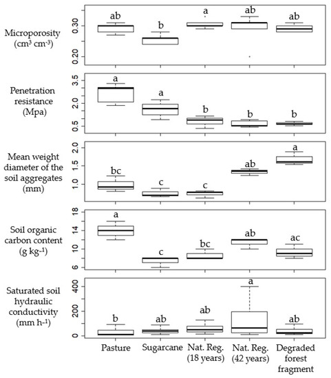 The values obtained for Ks in the NR18 and NR42 areas were classified as high, according to Soil Survey Staff [55]. Indeed, these Ks values indicated a good ability of the soil to infiltrate and percolate plant-available water to the root zone and to drain excess water out of the root zone [64]. These areas showed a tendency to improve the MWD and OC variables, where the latter is one of the primary agents of formation and stabilization of soil aggregates in the soil superficial horizons, with a direct influence on porosity [68,69]. The MWD indicates the largest stable aggregates in the soil in terms of structural organization. Aggregates with MWD greater than 0.25 mm are considered stable [68]. The addition of OC (root activity, growth, and functioning; death of plant tissues; among others) provides substrate for microbial growth and the production of secondary organic compounds that act as cementing agents. These agents help aggregate formation [70] and stabilization that increase their resistance when submitted to external forces [71]. A tendency for higher soil aggregation was evident in the NR18 and NR42 areas, improving soil structure and, consequently, Ks (Figure 3). Indeed, soils with a high degree of aggregate stability usually also have good soil physical quality, with good soil porosity, aeration, water retention and infiltration [72]. In this sense, soils with greater aggregate stability are considered structurally superior to similar soils with weaker aggregation [73].