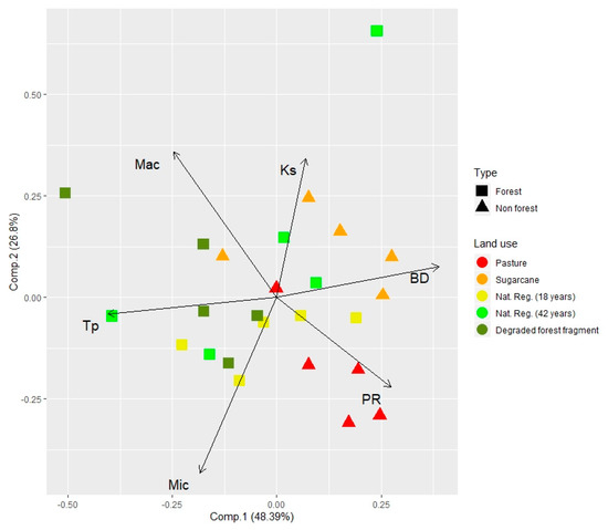 Component 1 represents 48.39% of the data variation, and the variables most related to this Axis were BD (positively) and Tp (negatively) (Table 3 and Figure 4). In addition, BD was positively correlated to PR, while Tp was mainly correlated to Mac and, to a lesser extent, to Mic. Ks remained almost perpendicular to component 1; this demonstrated that there was no correlation between this attribute with BD, considering all land uses.