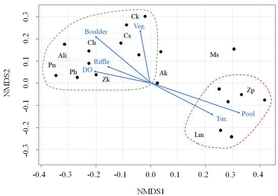 Non-metric multidimensional scaling (NMDS) was used to examine fish distribution patterns according to variations (five environmental variables and six habitat patches). The NMDS ordination plots were generated based on Euclidean distance, and goodness of fit was assessed in terms of loss of stress. Each variation was log-transformed after being assessed for normality with the Shapiro–Wilk test. Rare fish species with a low frequency (i.e., five individuals per study site) were excluded from the ordination analysis, leaving 11 species for final analysis. The stress value for the two-dimensional solution was 0.112, which is lower than the generally accepted maximum stress value of <0.2 []. The significance of the fitted vectors was assessed using 3000 permutations, with P < 0.05 considered significant. NMDS ordination was conducted with the R package “vegan” (version 2.5-3; []).