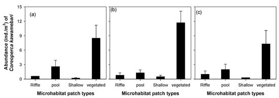 Abundance of Coreoperca kawamebari according to four microhabitat patch types in three study sites (from the left, sites 2, 4, and 8) located in the upper parts of the Geum River. Means labeled with a different letter indicate statistical subgroups defined by the post hoc test (Tukey honest significant difference (HSD), P = 0.05). (a) site 2, (b) site 4, and (c) site 8.