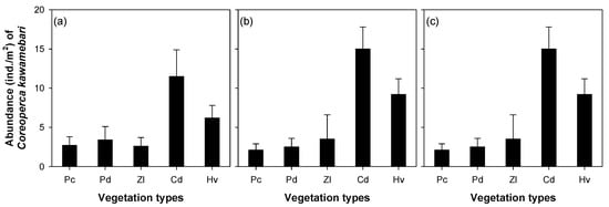 Abundance of Coreoperca kawamebari according to five vegetation types in three study sites (from the left, sites 2, 4, and 8) located in the upper parts of the Geum River. Means labeled with a different letter indicate statistical subgroups defined by the post hoc test (Tukey honest significant difference (HSD), P = 0.05). Pc, Phragmites communis; Pd, Paspalum distichum; Zl, Zizania latifolia; Cd, Ceratophyllum demersum; Hv, Hydrilla verticillata. (a) site 2, (b) site 4, and (c) site 8.
