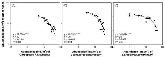 Relationship between abundance of Coreoperca kawamebari and fish abundance, excluding C. kawamebari, in the area covered by Ceratophyllum demersum types in three study sites (from the left, sites 2, 4, and 8) located in the upper parts of the Geum River. (a) site 2, (b) site 4, and (c) site 8.