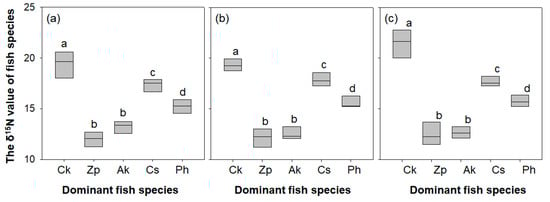 The δ15N value of each fish species in three study sites (from the left, sites 2, 4, and 8) located in the upper parts of the Geum River. Ck, Coreoperca kawamebari; Zp, Zacco platypus; Ak, Acheilognathus koreensis; Cs, Coreoleuciscus splendidus; Ph, Pungtungia herzi. Means labeled with a different letter indicate statistical subgroups defined by the post hoc test (Tukey honest significant difference (HSD), P = 0.05). (a) site 2, (b) site 4, and (c) site 8.