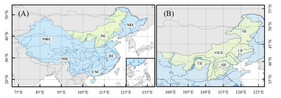 Map of China’s physiography regionalization (A) and the studied region (B). China’s physiography regionalization includes North China (NC), North East China (NEC), Eastern China (EC), Central South China (CSC), North South China (NSC), and North West China (NWC). The distribution of five river basins is showed in (B), including the Songhua River basin (SR), Liao River basin (LR), Yellow River basin (YR), Northwest River basin (NWR), and Hai River basin (HR).