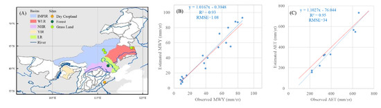 Model evaluation using the estimated mean water yield (MWY) vs. observed MWY from a water resources bulletin, and the estimated actual evapotranspiration (AET) vs. observed AET from the sites’ records. (A) Spatial distribution of the selected basins and sites of the dataset, the areas of the basins vary from 44,095 to 311,853 km2. (B) Evaluation of the estimated MWY versus observed MWY, including data from 2000, 2005, 2010, and 2015. (C) Evaluation of the estimated AET versus observed AET, including data from 2005 and 2010 available in the dataset. Red dashed line indicates a relationship with intercept = zero and slope = 1.
