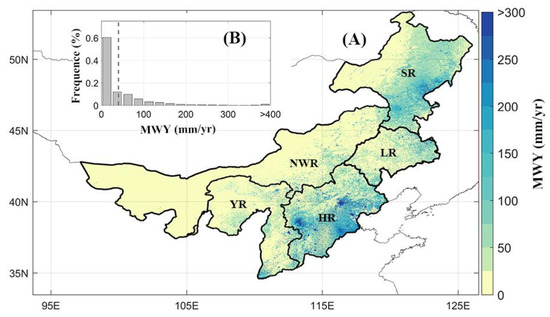 As shown in Figure 3A, the spatial patterns of the MWY showed a strong heterogeneity across North China. The MWY of the northeast and mid-south areas of the study region was relatively higher than others. The highest MWY was found in construction land, with values higher than 300 mm/year, because of the impermeable underlying surface and strong evaporation [14]. In contrast, for more than seventy percent of the pixels, the MWY is lower than 50 mm/year (Figure 3B), and are mainly distributed across the mid-north and west areas of the study region, west of the Songhua River basin and the middle of the Liao River basin.