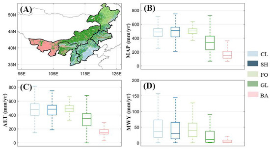 Similar variations were also found in the comparison of the mean actual evapotranspiration (AET) (Figure 4C), The AET of forest, shrub, and cropland was higher than for grassland and bare land. In detail, the AET of most forests was higher than 450 mm/year, and the AET of cropland and shrub was mainly higher than 400 mm/year. Meanwhile, the AET of grassland was also higher than for BA, which was higher than 220 mm/year. The AET of bare land was the lowest, which was normally lower than 200 mm/year.