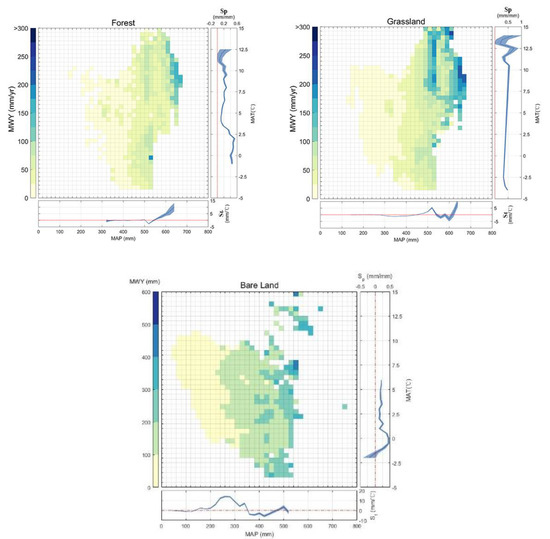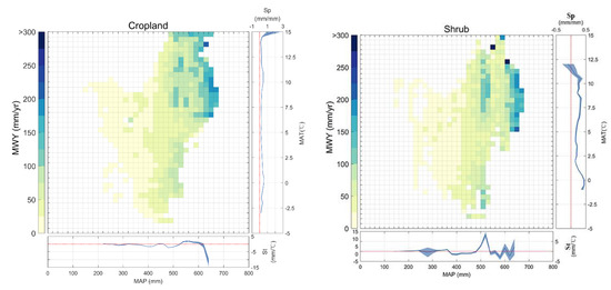 Distribution of the MWY in a two-dimensional space with (MAT) and (MAP) binned into intervals of 0.5 °C for the MAT and 20 mm for the MAP. For each figure, the sensitivity of the MWY to temperature (St) along the precipitation gradient is shown under the figure and the sensitivity of the MWY to precipitation (Sp) along the temperature gradient is shown on the right of the figure. The shaped area indicates 95% significance intervals of St and Sp, while the bins have more than 100 grid pixels.