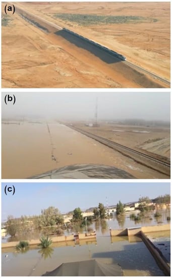 (a) Change in the natural appearance of land-use due to the presence of the Al-Shamal train pathway, which impedes the natural wadi runoff; (b) detaining of Wadi Bayer floodwater in front of the Al-Shamal train pathway on 10 November 2018; and (c) flooding of Bayer village due to the detaining of floodwater in front of the Al-Shamal train pathway on 10 November 2018.