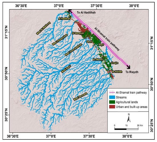 The main concern of this study is to shed light on the flood hazards in the study area, concentrating on the impacts of five main wadis (from west to east and from north to south), namely: Wadi Al-Makhrouk, which influences Hadithah village to the north of Qurayyat city and strikes the railway in the north; Wadi Haseidah Al-Gharbiyeh, which affects the north of Al-Qurayyat city; Wadi Haseidah, Umm Nakhleh, which influences the southern part of Al-Qurayyat city; Wadi Bayer, which threatens the villages of Bayer and Ghati, and covers the railway track part facing them; and, finally, Wadi Sarmada, which impacts on the villages of Al-Nasifah, Skullim, and Al-Rudaifa.