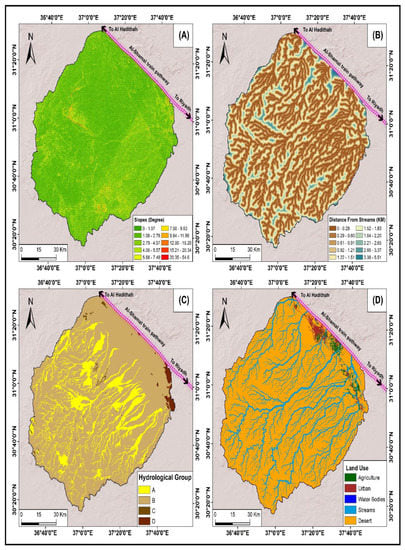 The criteria used in the study: (A) slope; (B) distance from wadis; (C) hydrological soil groups; and (D) land cover affecting the Al-Shamal train pathway in Al-Qurayyat city.