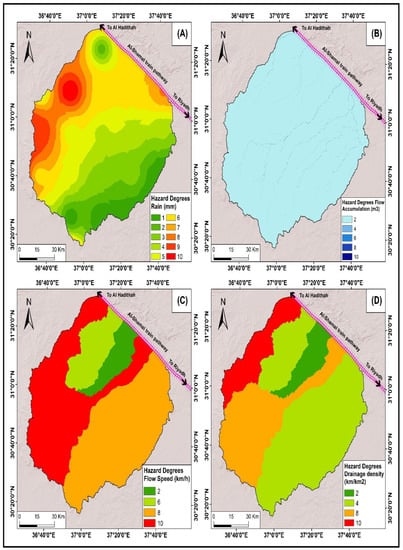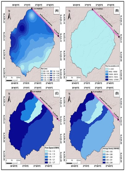 Criteria affecting the Al-Shamal train pathway to flood hazard in Al-Qurayyat city: (A) rainfall density; (B) flow accumulation; (C) runoff speed; and (D) drainage density.
