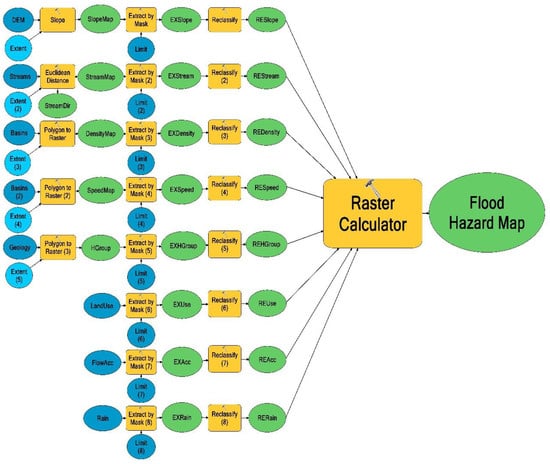 This stage is the prefinal part of the study, which involves the creation of the structural model constructed within the ArcGIS environment to extract all the needed criteria automatically by adding the required ArcGIS modules to get the flood hazard map [40]. The model included the following: (1) the distance maps were generated to produce the proximity distance between different criteria by using the ArcCatalog, the Spatial Analysis toolbox, and the Euclidean Distance. (2) The slope criterion was used to create a slope-surface map. (3) All criteria maps were reclassified to define the categories of spatial suitability for each criterion. (4) As a subsequent step, all criteria layers were clipped using the ‘Extract by mask’ tool to match the boundary of the study area. (5) Then, the Raster Calculator was applied to overlay all the criteria layers according to the obtained AHP weights specified for each criterion (weighted overlay). (6) The final step was to run the structure model to get the flood hazard map in five classes: very high, high, moderate, low, and very low. The structural model of flood hazard on the Al-Shamal train pathway created by integrating GIS-MCDA and AHP is presented in Figure 7.