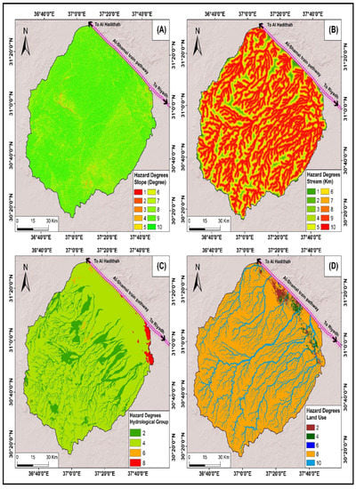 The degrees of hazard of the criteria affecting the Al-Shamal train pathway in Qurayyat city in 2020: (A) slope; (B) distance to wadis; (C) hydrological soil groups; and (D) land cover.
