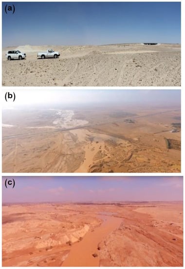 (a) Field visit to the area below the Al-Shamal train pathway in Al-Qurayyat city; and (b,c) Wadi Bayer during the floods on 10 November 2018.