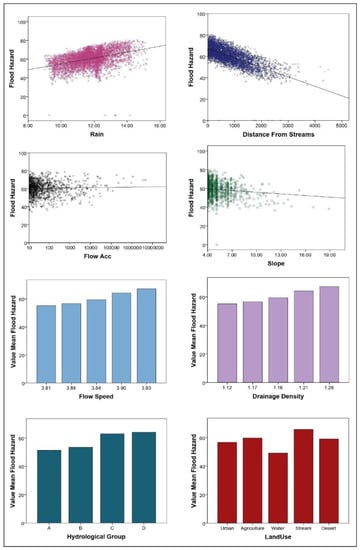 The land cover determines the areas which are vulnerable to flood hazards. Urban areas and agricultural lands are considered less vulnerable to floods (the lowest hazard), as they obstruct and consequently decrease the runoff speed, in addition to the presence of branched irrigation and drainage channels in such areas. In contrast, wadis, swamps, and desert areas are the most vulnerable to floods and have the highest hazard [36,42,43,44].